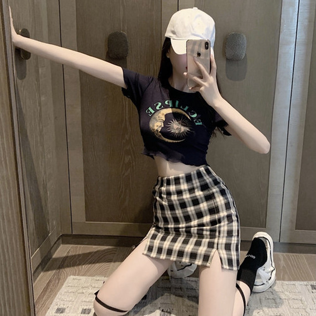 チェック柄のミニ丈スカートに、ショート丈のタイトなTシャツを合わせた韓国風ストリートコーデです。