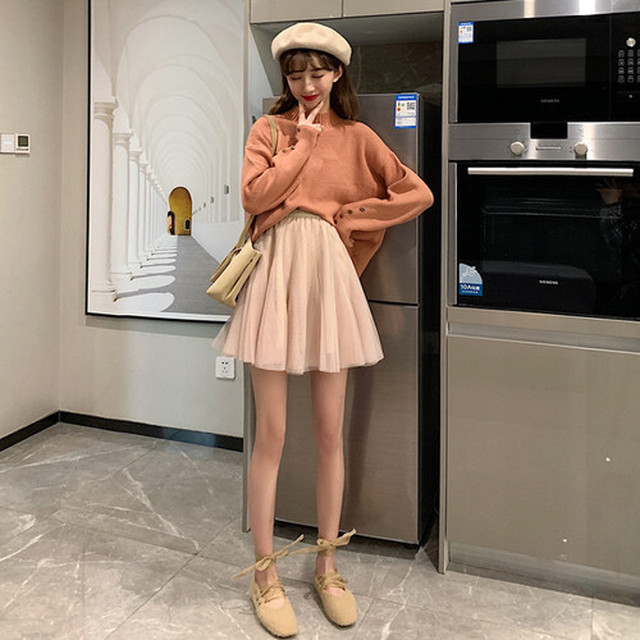 ゆるっとしたニットを合わせると、思わず守ってあげたくなるキュートなコーデが完成します。