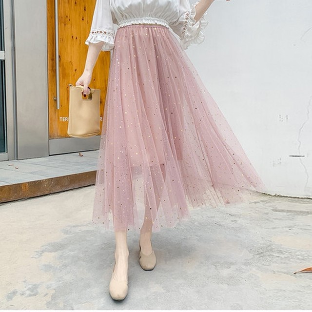 フェミニン系韓国コーデには、淡い色をメインにしたスカートが定番アイテムです。