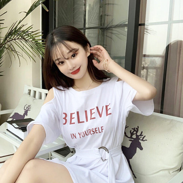 大胆な大き目ロゴ入りの肩開きTシャツ