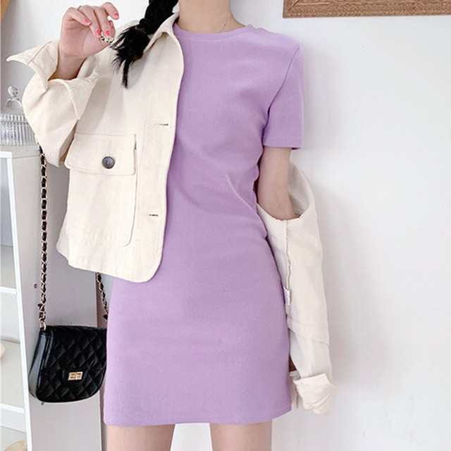 シンプルなのに、パープルの透明感で女っぽいミニ丈ワンピースです。