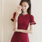 レトロ な ステッチ刺繍 と フリンジ が目を引く クラシカル な 半袖 タイトニットワンピース です。