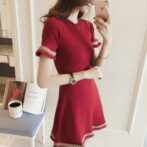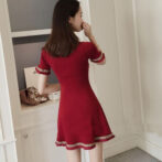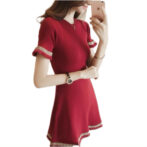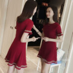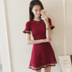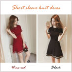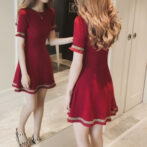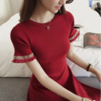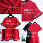 【赤 / フリーサイズ】ミニワンピース 半袖 ニットワンピ 刺繍 フリンジ サマーニット Aライン丈 ミニ丈 ラウンドネック お出かけ タイト スリムワンピ