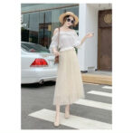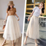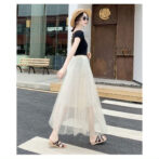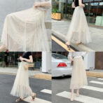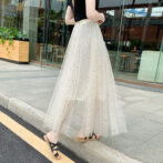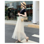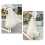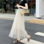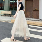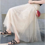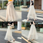 【フリーサイズ】アプリコット スパンコール チュールスカート マキシ丈 ハイウエスト Aライン プリーツ レース かわいい レディース