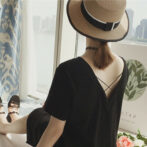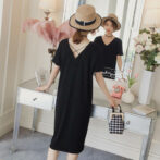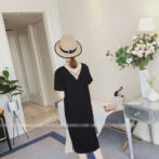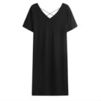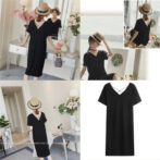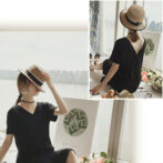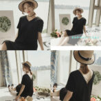 【ブラック/フリーサイズ】オルチャンファッション ワンピース カジュアル 韓国ファッション 背中見せ Vネック Aライン ひざ丈