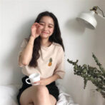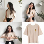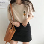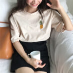 【ベージュ/フリーサイズ】Tシャツ 五分袖Tシャツ レディース カジュアル シンプル 可愛い パイナップル 刺繍 果物柄 体型カバー プルオーバー お洒落