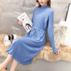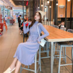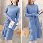 【水色】 ワンピース レディース 長袖 膝下 膝丈 秋 冬 Aライン ハイウエスト フレア セミフォーマル