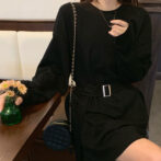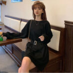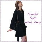 【黒 / フリーサイズ】ワンピース 長袖 ミニ丈 無地 チュニック ベルト付き バルーン袖 ラウンドネック Aライン ミニワンピ オーバーサイズ 体型カバー 着やせ ゆったり シンプル