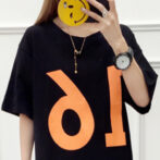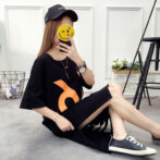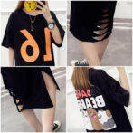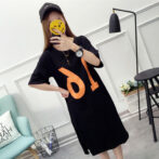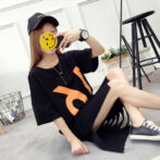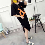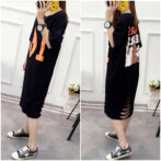 【 ブラック ・ ワンサイズ 】 レディース Tシャツワンピース 韓国ファッション オルチャン 半袖 ロゴプリント スリット