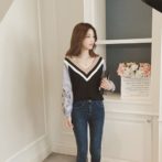 カラー は ソリッド な 黒ベース で 白 と ベージュ の Vネック と、