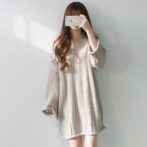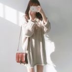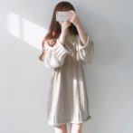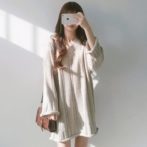 ニットワンピース ベージュ ひざ丈 プルオーバー Vネック 長袖 ゆったり 無地