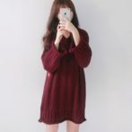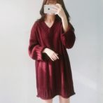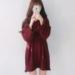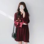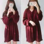 ニットワンピース レッド ひざ丈 プルオーバー Vネック 長袖 ゆったり 無地